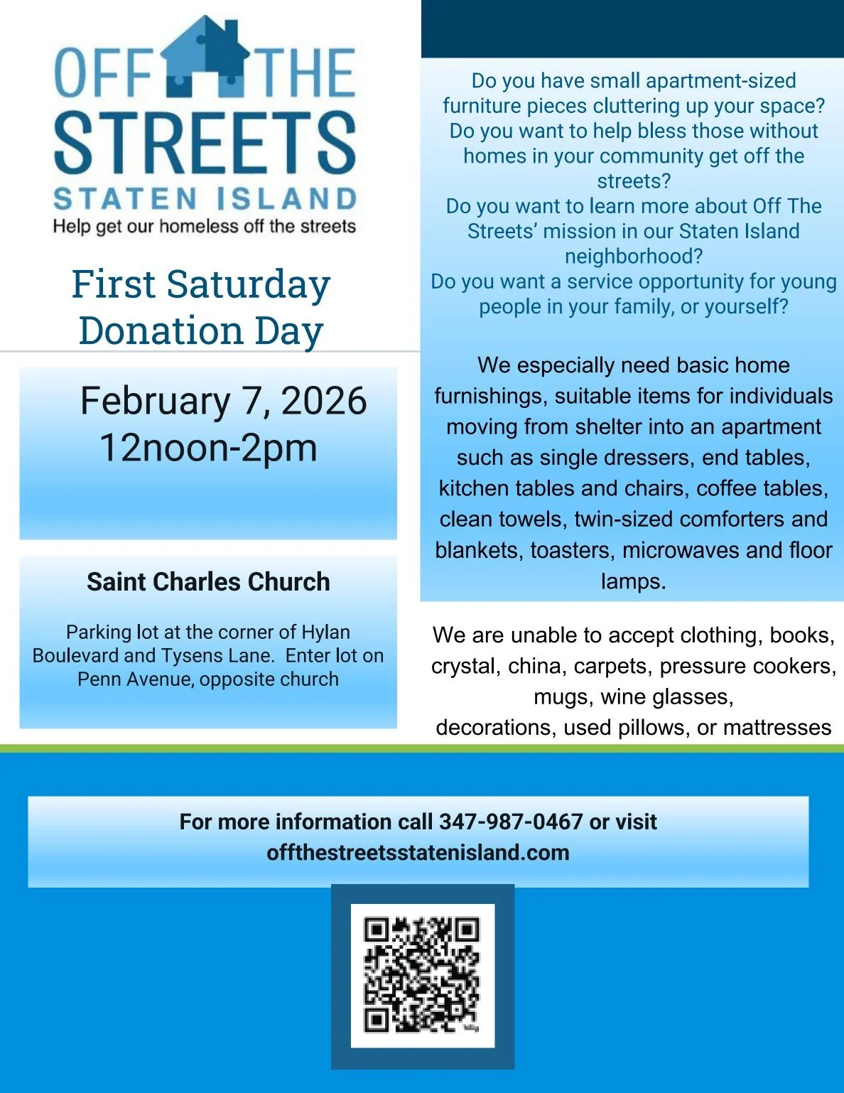 Off The Streets Staten Island Inc. is a 501(c)(3) charitable organization that provides hope and dignity to those experiencing homelessness by helping them transition to permanent housing. We assist people referred by local social service providers with a security deposit and basic furnishings. We perform these tasks using only volunteers and donations, and accept no government funding.